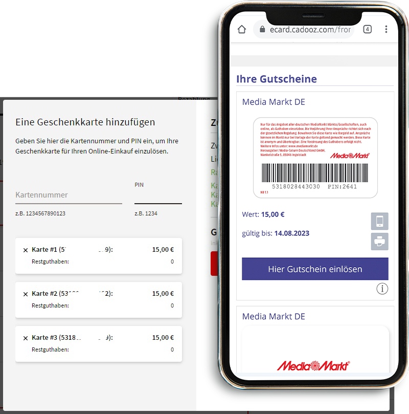 Einen Saturn-Gutschein können Sie sowohl online als auch im Geschäft bei Media Markt einlösen. Das gilt nur für Geschenkgutscheine, also Gutscheinkarten mit einem konkreten Gegenwert..