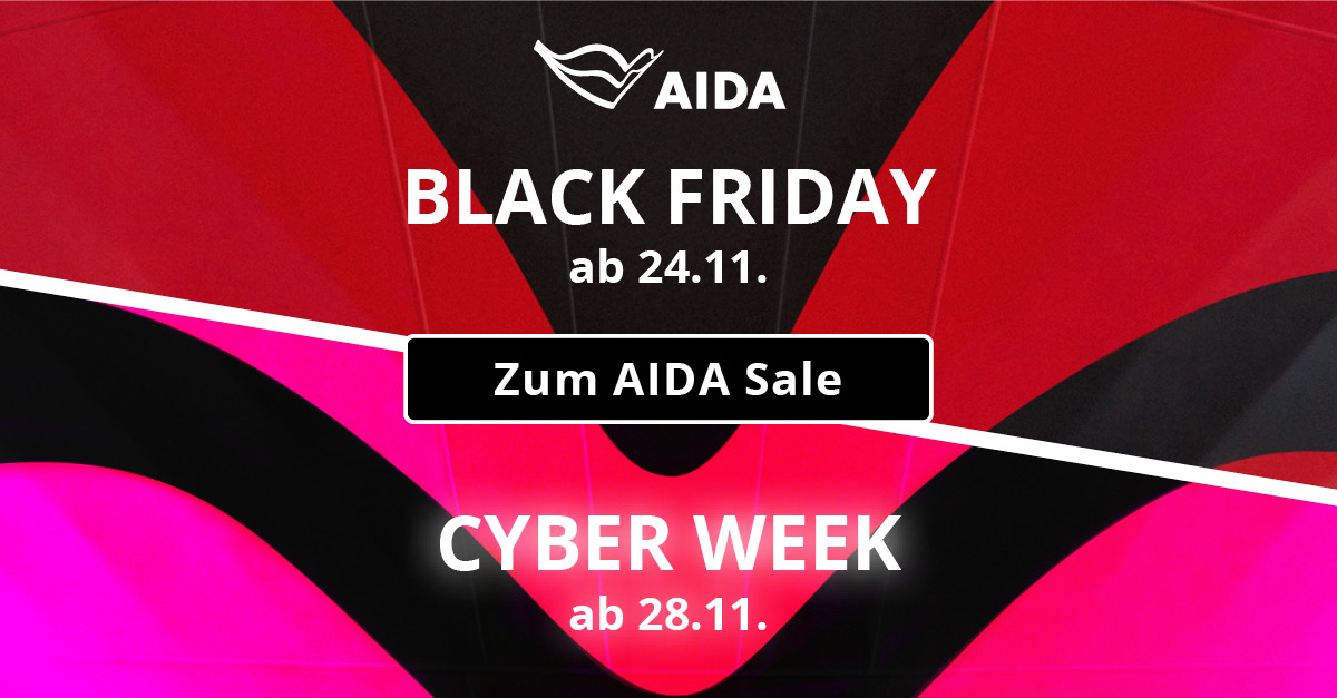AIDA Black Friday 2023. Auch die Rostocker Reederei AIDA Cruises möchte am Black Friday und in der kommenden Wochen mit der AIDA Cyber Week wieder ganz besonders viele Angebote streuen. Angekündigt werden „super Deals für den Traumurlaub im Winter" und „Preis-Highlights für das erste AIDAsehen in 2024. Ab dem 23.