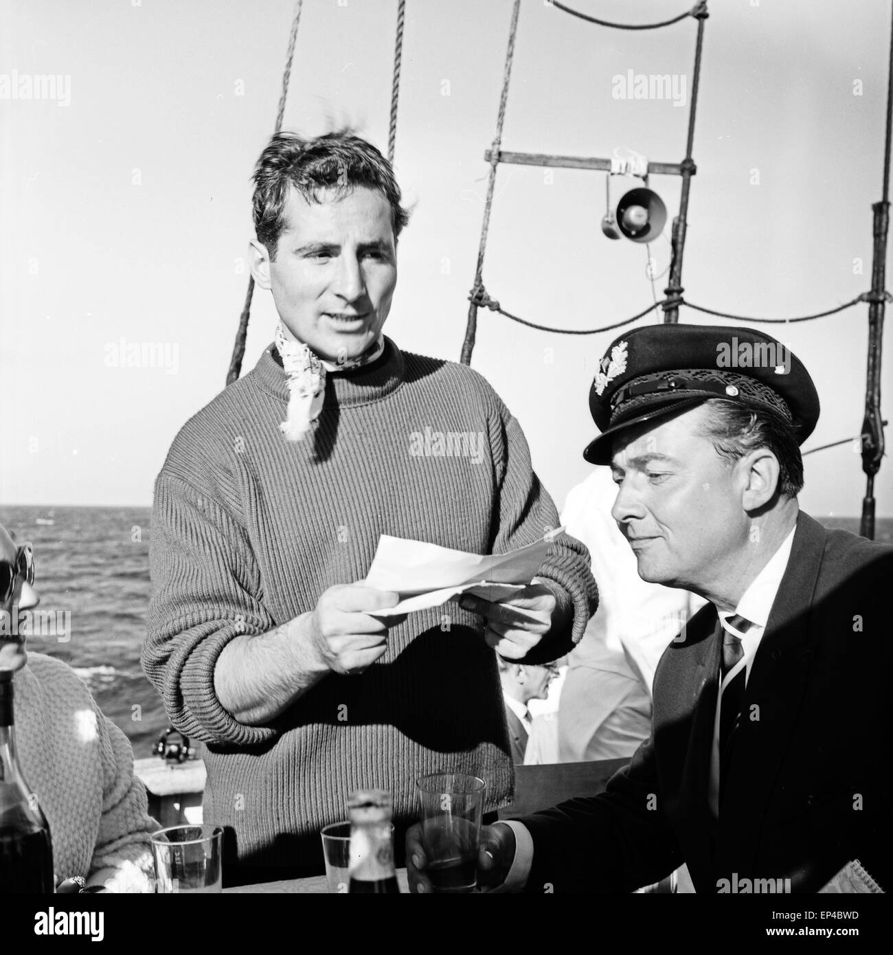 Deutscher Sänger Freddy Quinn bekommt eine goldene Schallplatte auf dem Polydor Schiff "Heimweh