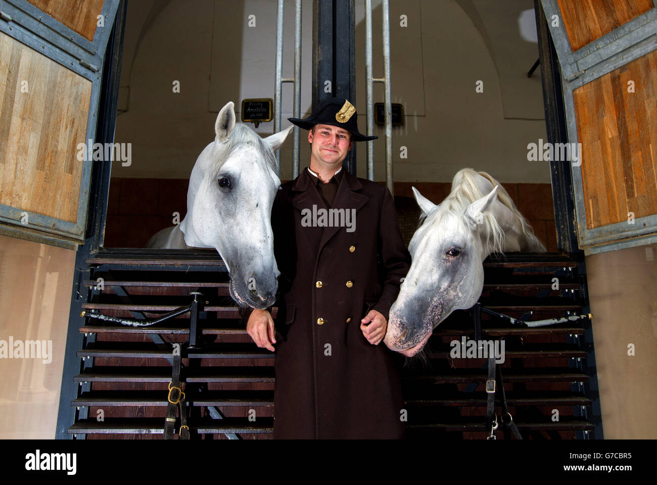 Reiter Florian Bacher von der Spanischen Hofreitschule Wien posiert mit zwei LipizzanerHengsten