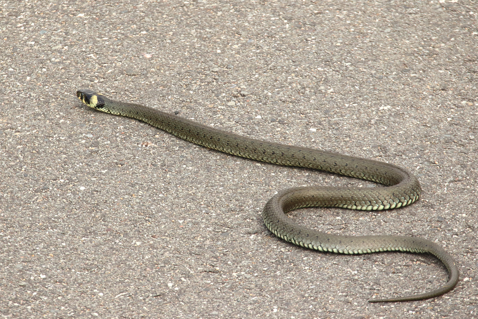 Ausgewachsene Ringelnattern sind 80 bis 120 Zentimeter lang, einzelne Exemplare können noch größer werden. Der Körper der Ringelnatter weist meist eine hell- bis dunkelgraue Grundfarbe auf, dazu kommen dunklere Flecken auf dem Rücken und an der Seite. Leise und blitzschnell verschwindet ein langgestrecktes Tier im Gebüsch.